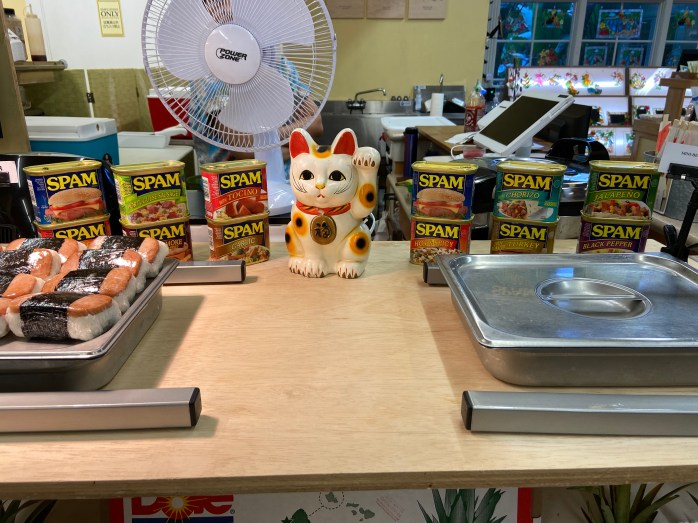 Spam is very popular in Hawaii — they eat it with everything!!! There are many different varieties and flavors of Spam – who knew? AND…..that tray of bars on the left side is actually SPAM SUSHI – packed rice between two pieces of Spam…….I don’t get it, but to each his own, I guess!
