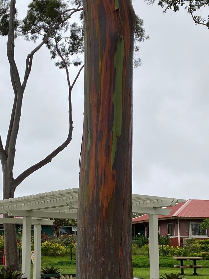 These are rainbow (something) trees —- so beautiful!!! I was told the bark starts out brown and peels to this rainbow color and then barks over, again, and peels, again…..and so on!