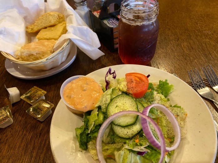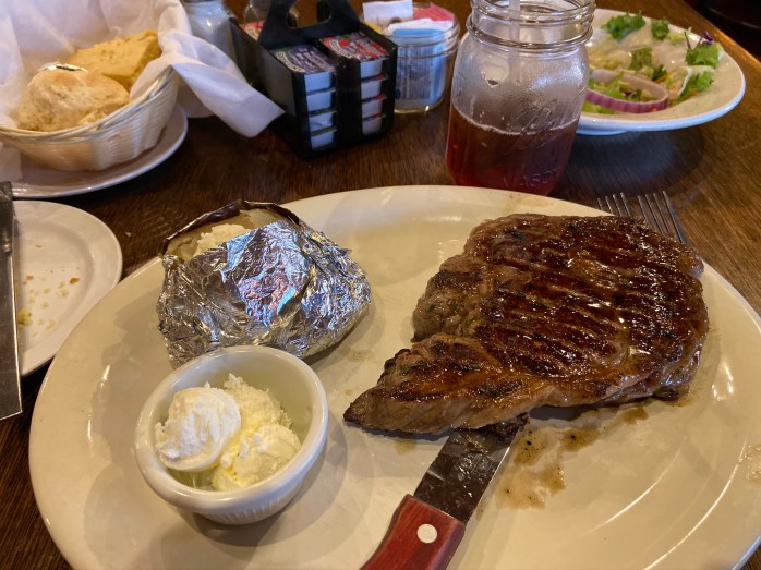 Ribeye, salad, baked potato, and sweet tea…….perfect sweet tea…….between the two meals, I must have gone through a gallon or more of refills! LOL