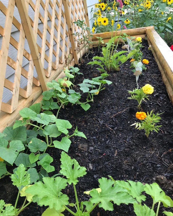 My new raised garden bed built by a friend…..the top part has my first ever attempt at growing veggies (with some marigolds to keep the bugs away) – I started out easy – just some tomatoes, cucumbers, yellow squash, and zucchini for my first year…..we’ll see how it goes!