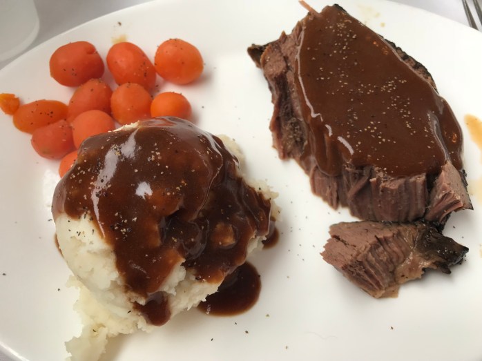 My lunch —- it was soooooo good —- the best roast beef I’ve had in a long time! So tender, juicy, and a rich, delicious flavor! The potatoes were good, too! But, it was the carrots that had everyone talking — both the roast beef and chicken entrees came with the carrots —- we all thought they used some special tool to make them into those little balls and everyone commented on how super sweet and tender they were! Simply amazing!!! Later, Mitzy, our travel agent who organizes trips for the group, told us they were from Argentina and they actually grow that way!!! I gotta try to find them…….maybe Wegmans carries them???!!!! They also served us a wonderful salad, rolls, and a brownie for dessert!