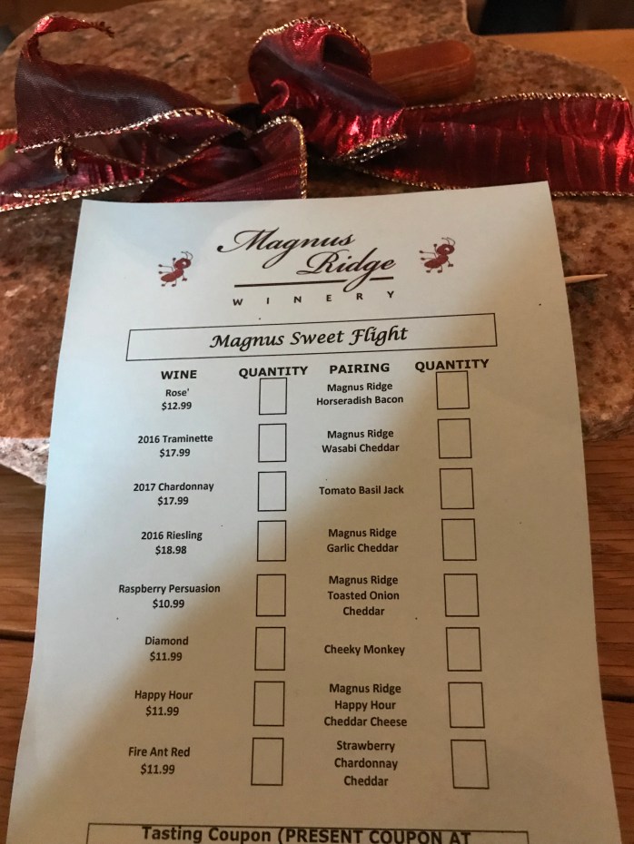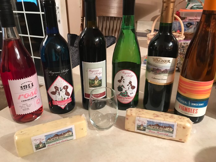 And, this is what I bought —- remember, one bottle and the cheese is for my brother’s birthday, so it isn’t as much as it looks like……hahaha! For myself, I got two from Wagner Winery and three from Magnus Ridge Winery…..and the complimentary wine glass (they gave it to us……I didn’t sneak it off in my purse!!! hehehe)