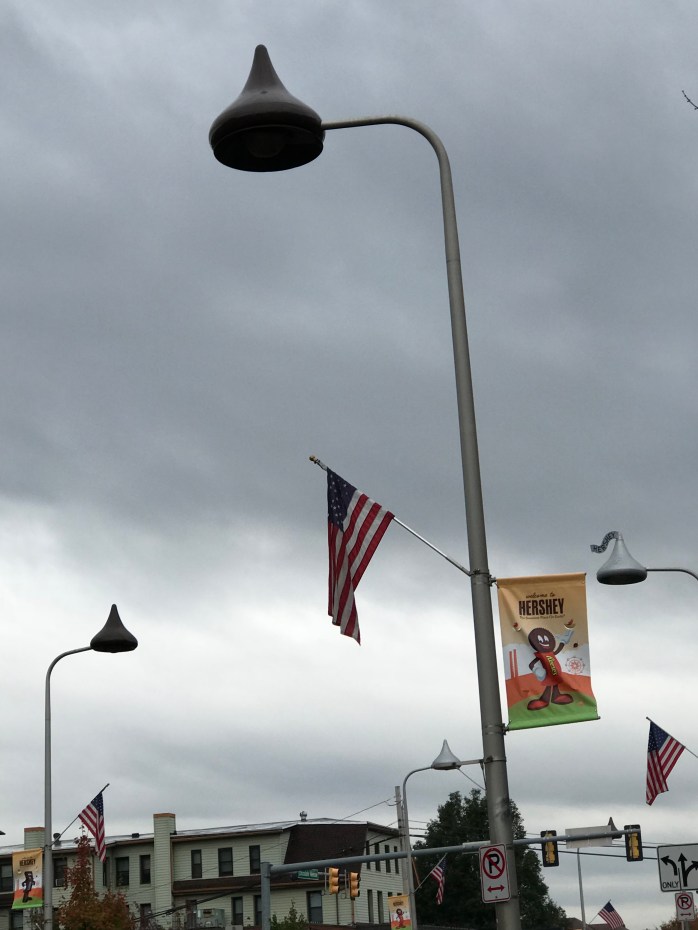 The street lights along Chocolate Ave are shaped like Hershey Kisses…..every other one was unwrapped chocolate and wrapped silver!
