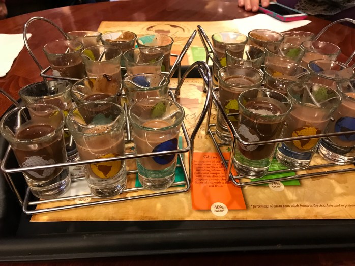 Our Groupon for the museum included chocolate tastings……we got six flights of chocolate made from cocoa beans from different places around the world! The shot glasses had hot chocolate in them and they were soooooooo good!!! Each one had a distinctly different taste and there was a method to the tastings – start with the most concentrated cocoa and go down……darkest to lightest! I so wanted more!!!