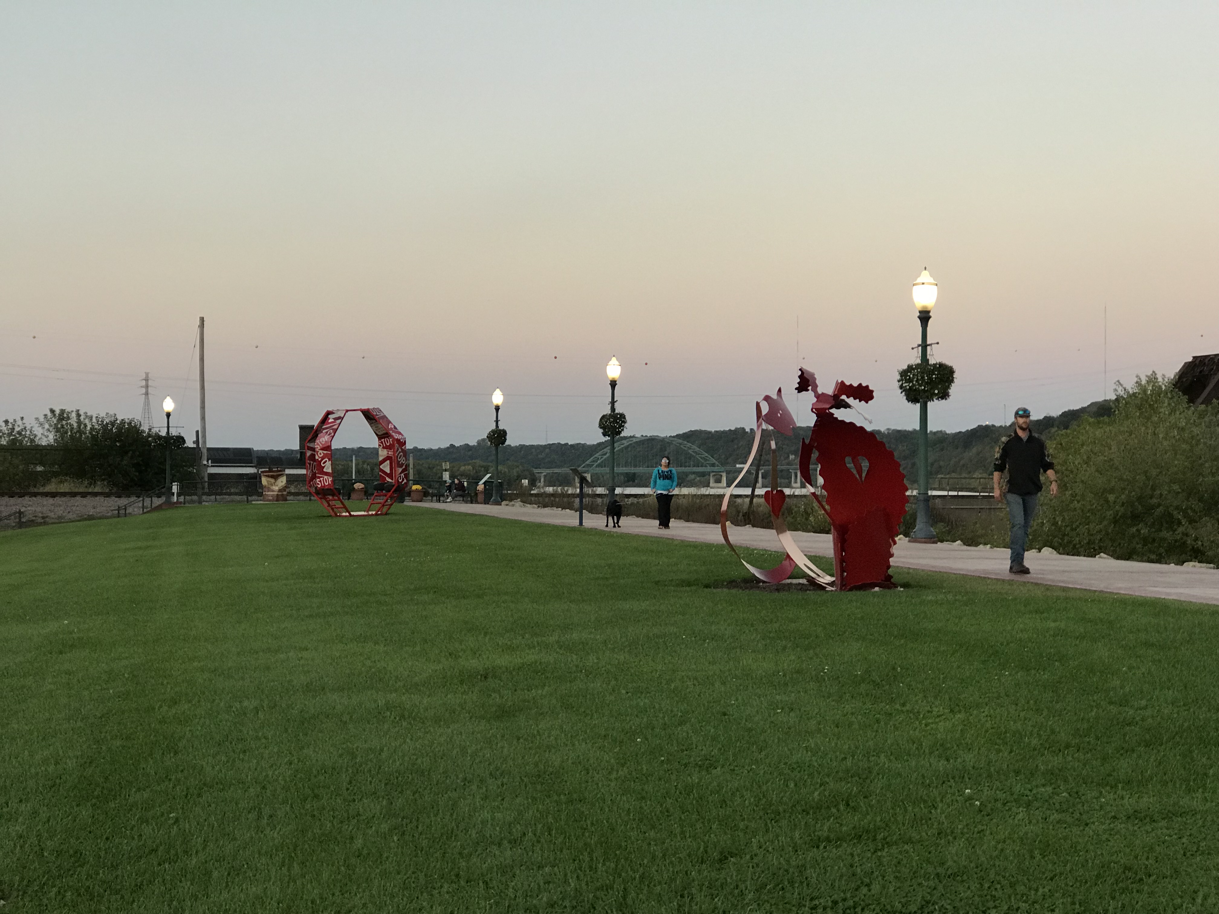 Dubuque is located right on the Mississippi River. It is a cool city with a beautiful downtown and river front areas. I arrived about dinner time my first day – the plan was to arrive mid-morning, but they over sold the flight and asked for volunteers to be bumped and, once the incentives made it worth me losing about 1/2 a day of my trip, I took it! I arrived later than planned, but ended up with a $1000 travel voucher and a free lunch! So, I didn’t have as much time my first day as I hoped, but I did get to go to the Mississippi River Walk for a nice stroll – it was a warm, breezy evening and there were several people out enjoying the wonderful walk-way along the river.