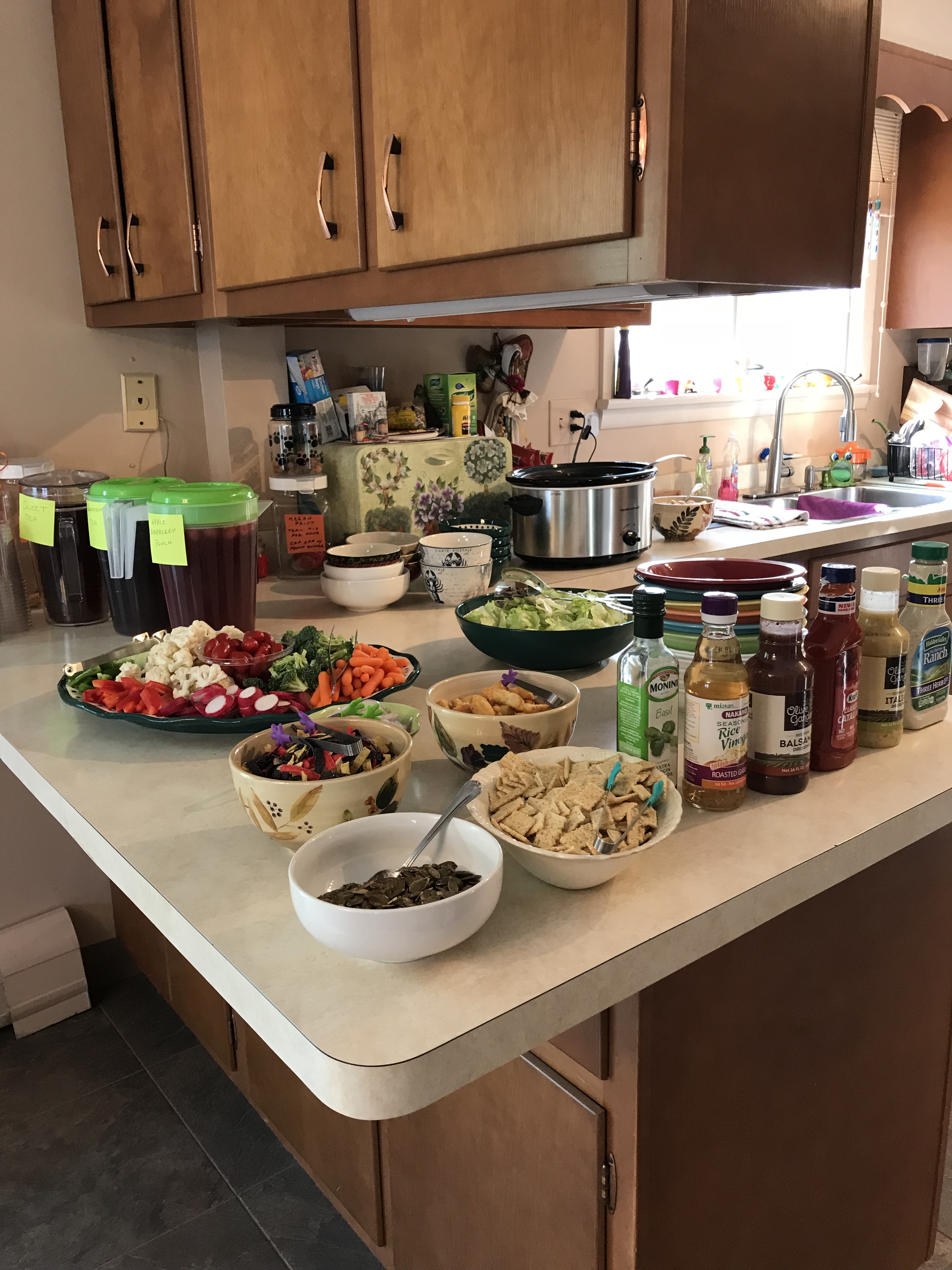 My home was the Soup/Salad Course stop for a Progressive Lunch with a group of 12 ladies from my church…….soup/salad isn’t easy to eat standing up, so I had to get creative with my seating —- 6 at the dining room table and a folding picnic table in the living room for the other 6! 🙂