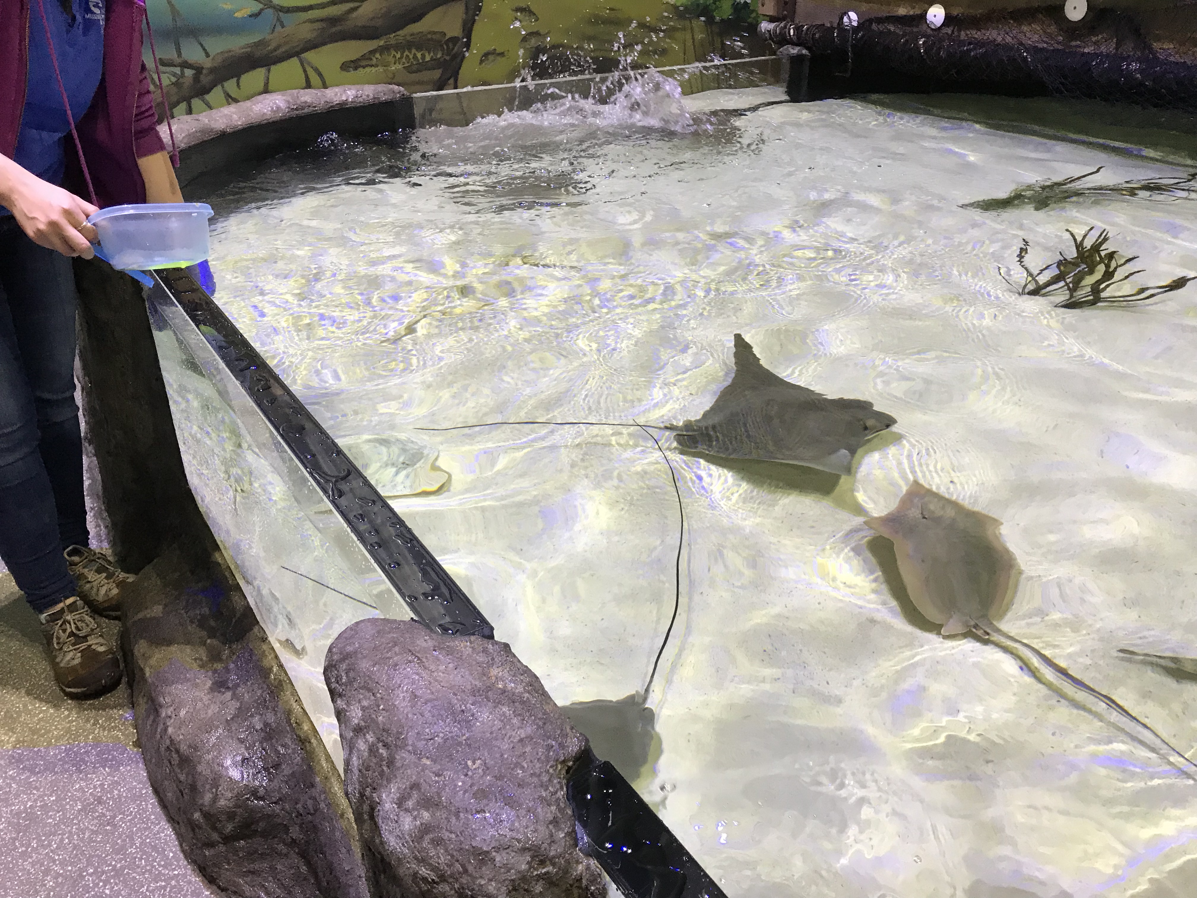 I got to pet the stingrays — that was fun! They enjoy being touched – if you put your hand in the water, they swim up and rub themselves against your hand!