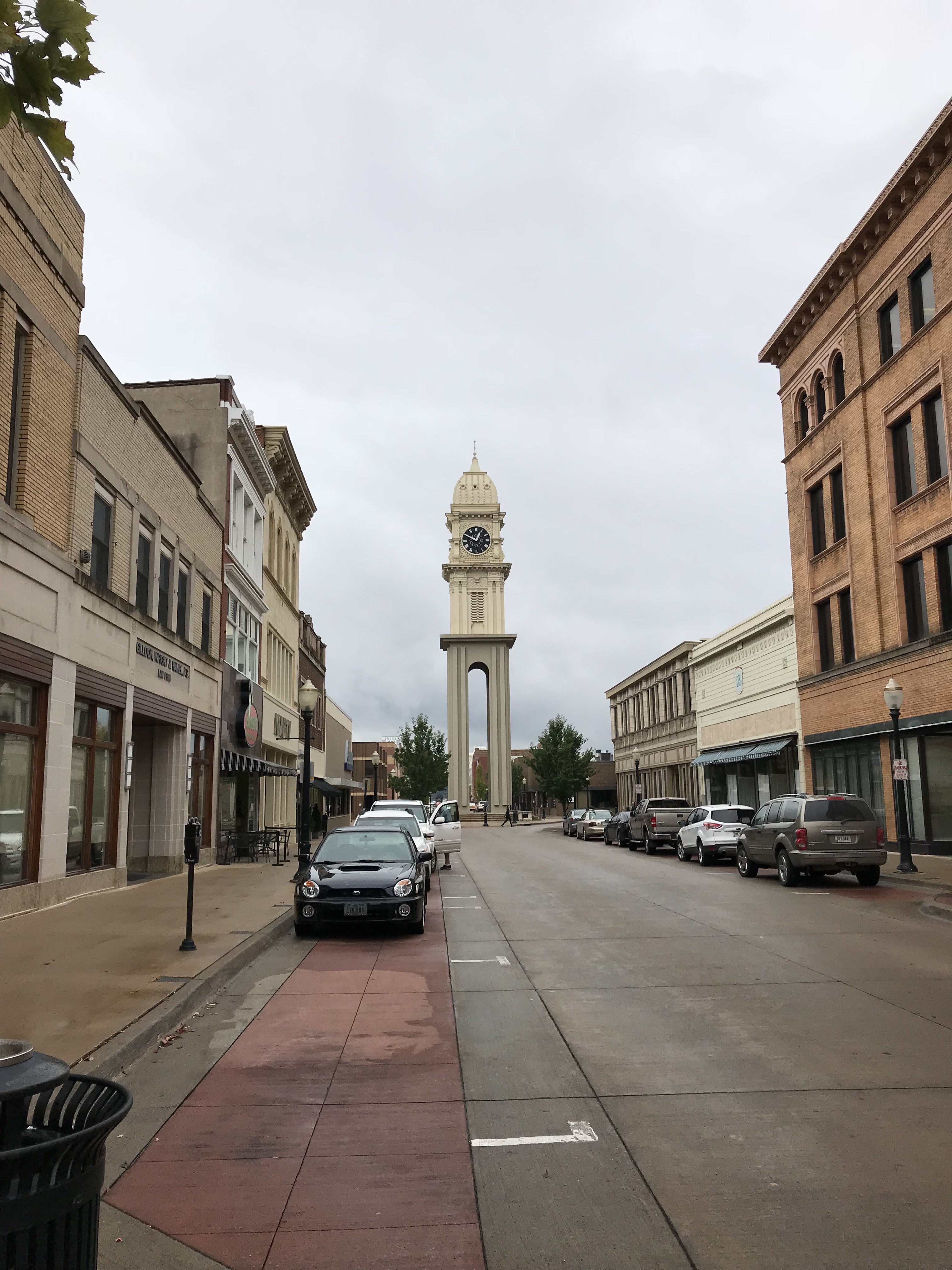 Dubuque has a marvelous clock tower in the center of downtown with a traffic circle around it and areas to sit and enjoy the day on either side
