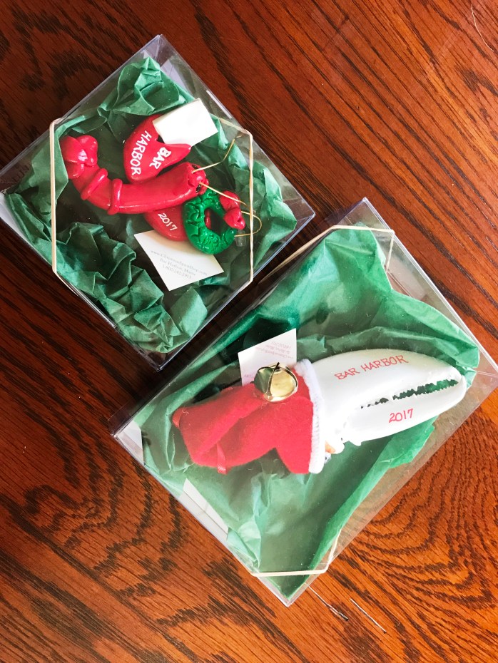 I bought these ornaments at a Christmas shop in Bar Harbor……the claw one is an actual Lobster claw!