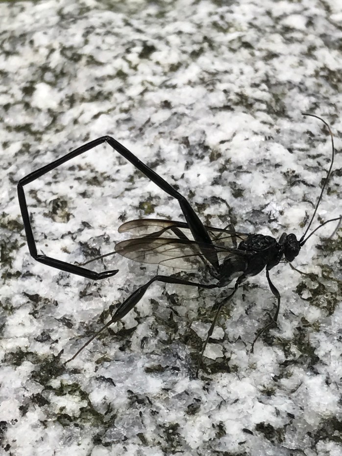 I posted the pic on the FB page of a friend who is a bug expert…..she has a much more impressive title and works in the field of Entomology research, but “bug expert” sums it up nicely! Before she saw it, a friend of her’s responded with: “That is a pelecinid wasp, specifically Pelecinus polyturator. They parasitize June beetle larvae; hence the long ovipositor”. (in plain English, he said it is a “good bug, unless you’re a June Beetle”!)
