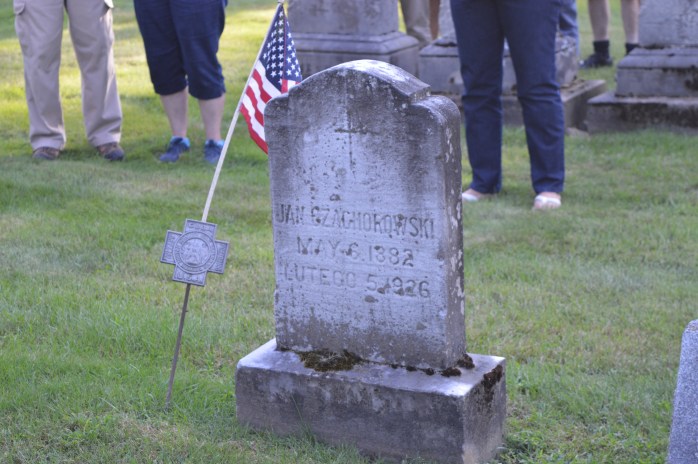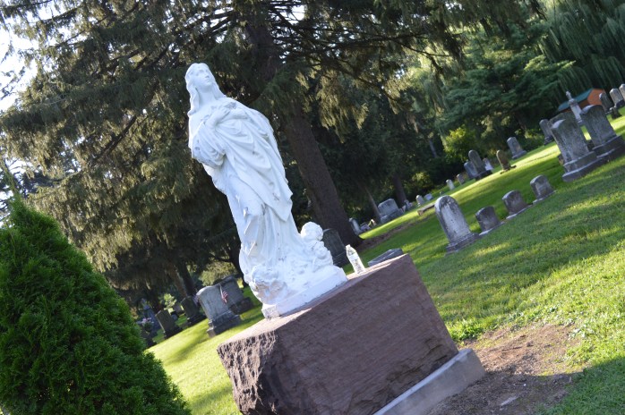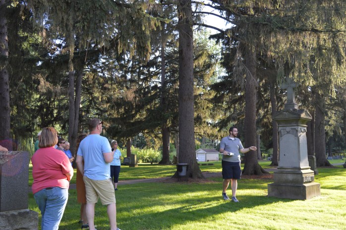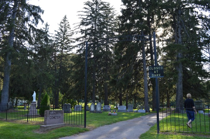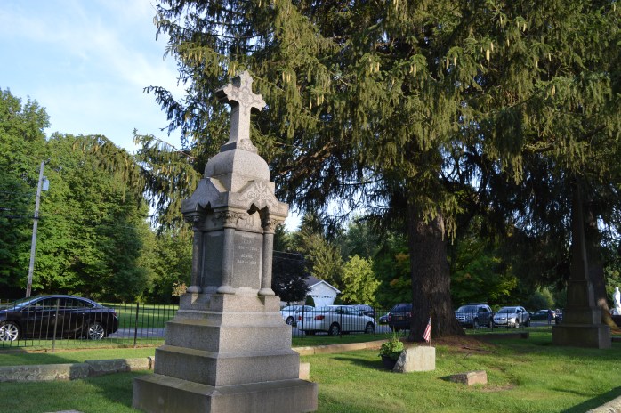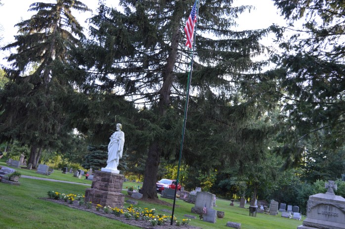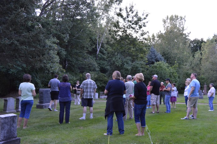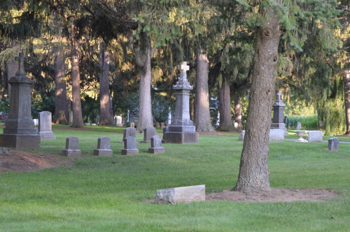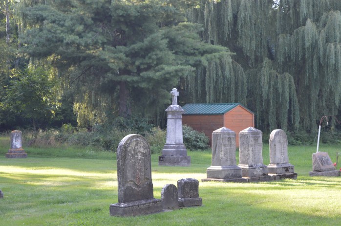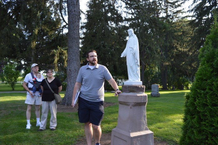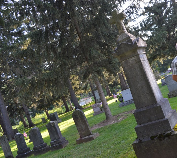 This evening, I attended the second in the annual series of Walking Tours of local Albion cemeteries held in August each year. Tonight’s tour was of the Old St. Joseph’s Cemetery on Brown Road. This cemetery had some interesting stories and rich history relating to the Catholic immigrants that formed the St. Joseph and St. Mary Assumption Churches in Albion. This was the first cemetery dedicated to Catholic burials in the area – a precursor to the current St. Joseph Cemetery on Rt. 31.