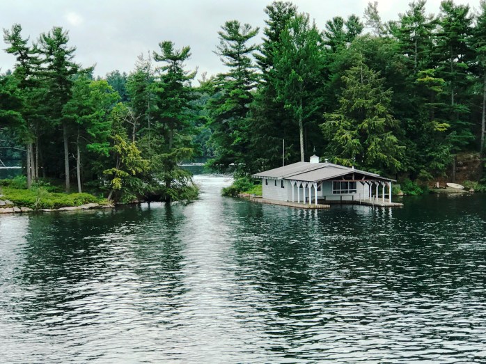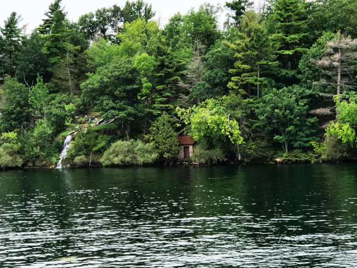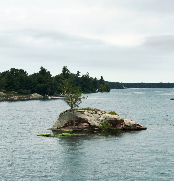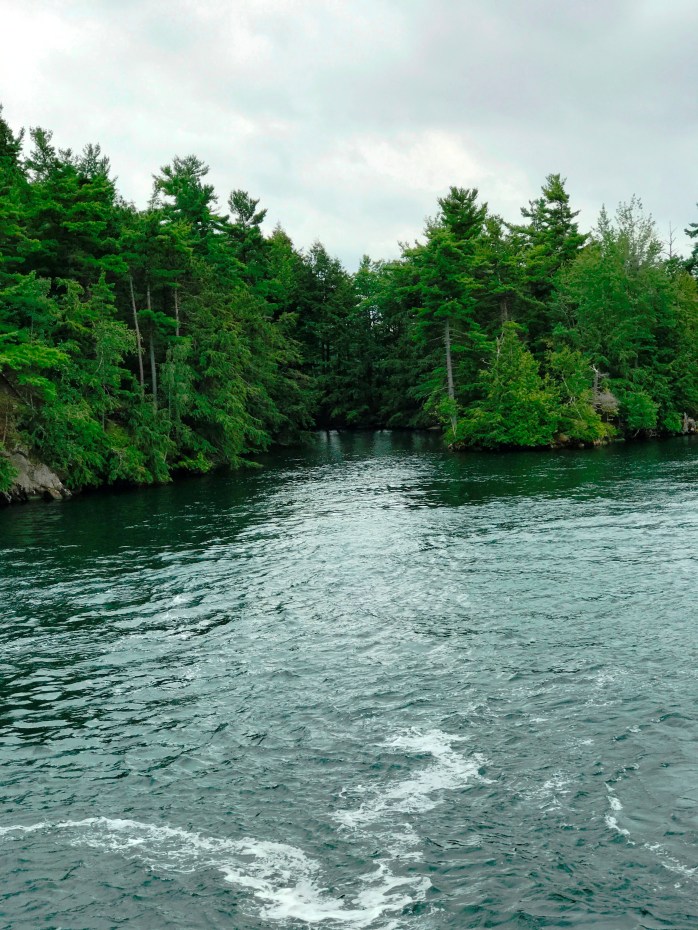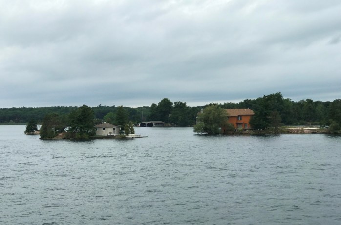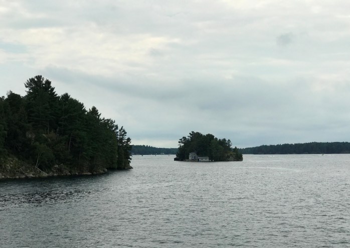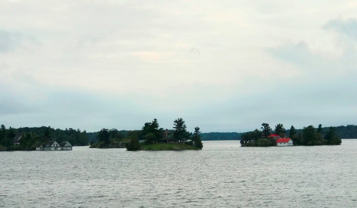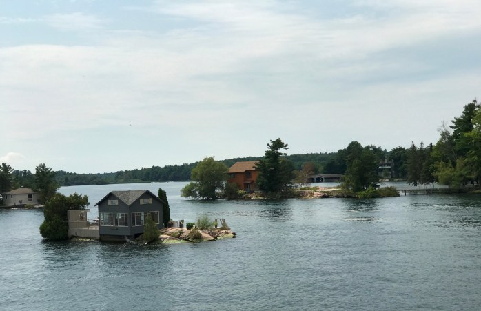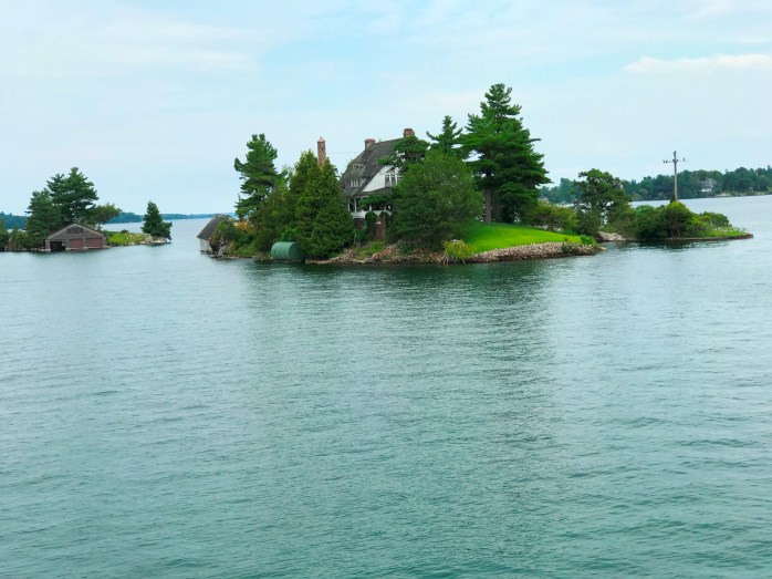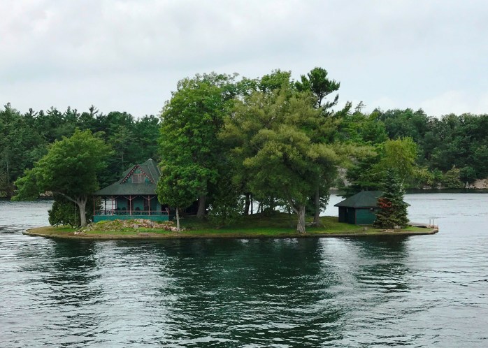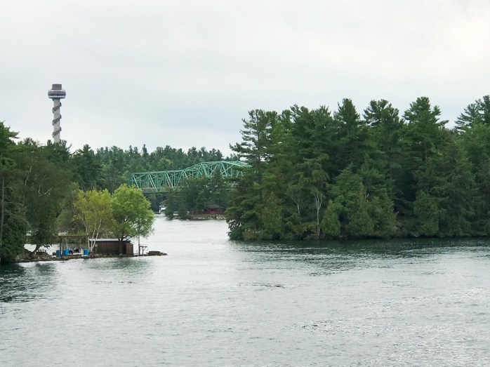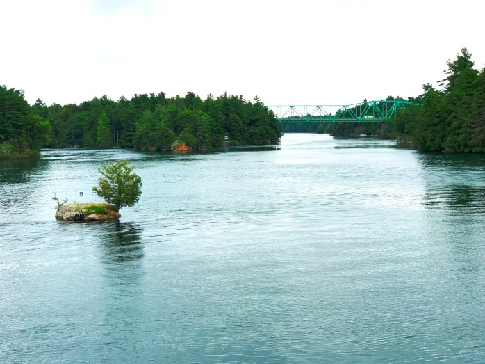 The Thousand Islands stretch stretch out about 50 miles in the St. Lawrence River (which starts at the northeast corner of Lake Ontario, connecting the Great Lakes with the Atlantic Ocean just down stream from Quebec City) and are part of the international boundary between the US and Canada. Most of the islands are on the Canadian side in the Providence of Ontario, but many of the largest of the islands are on the US side in the state of NY. None of the islands straddle the US/Canadian border, however, a popular bit of trivia is that Zavikon Island is a pair of islands in which the larger is in Canada and the smaller in the US with the smallest International footbridge in the world joining them….this, per Wikipedia, is not accurate – both Zavikon is completely inside the Canadian Providence of Ontario…..cool story, though!