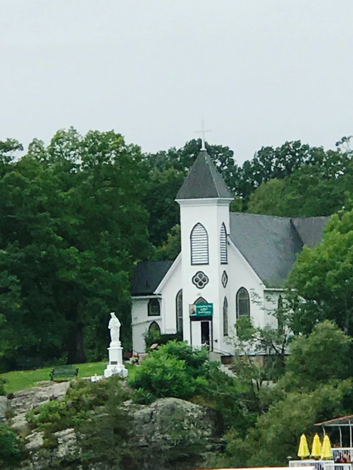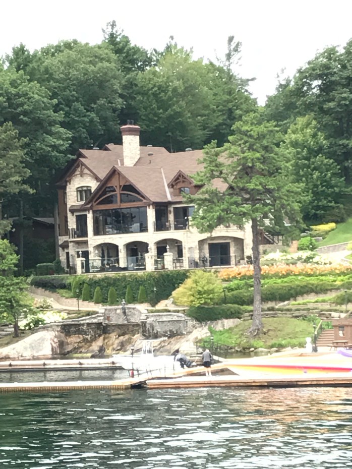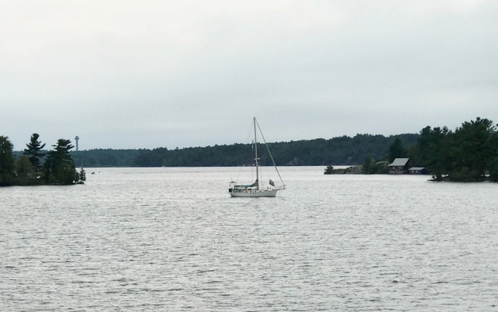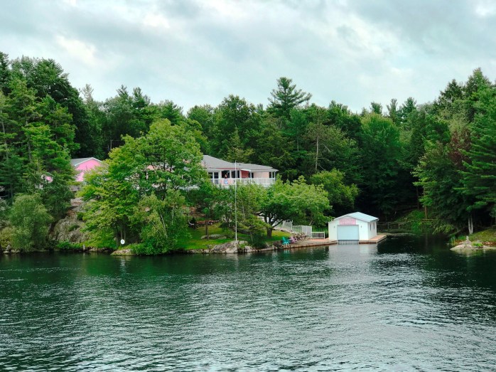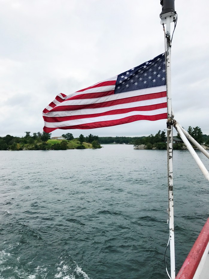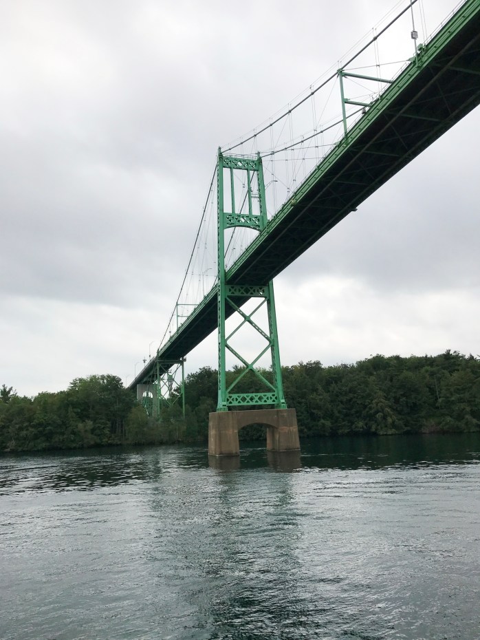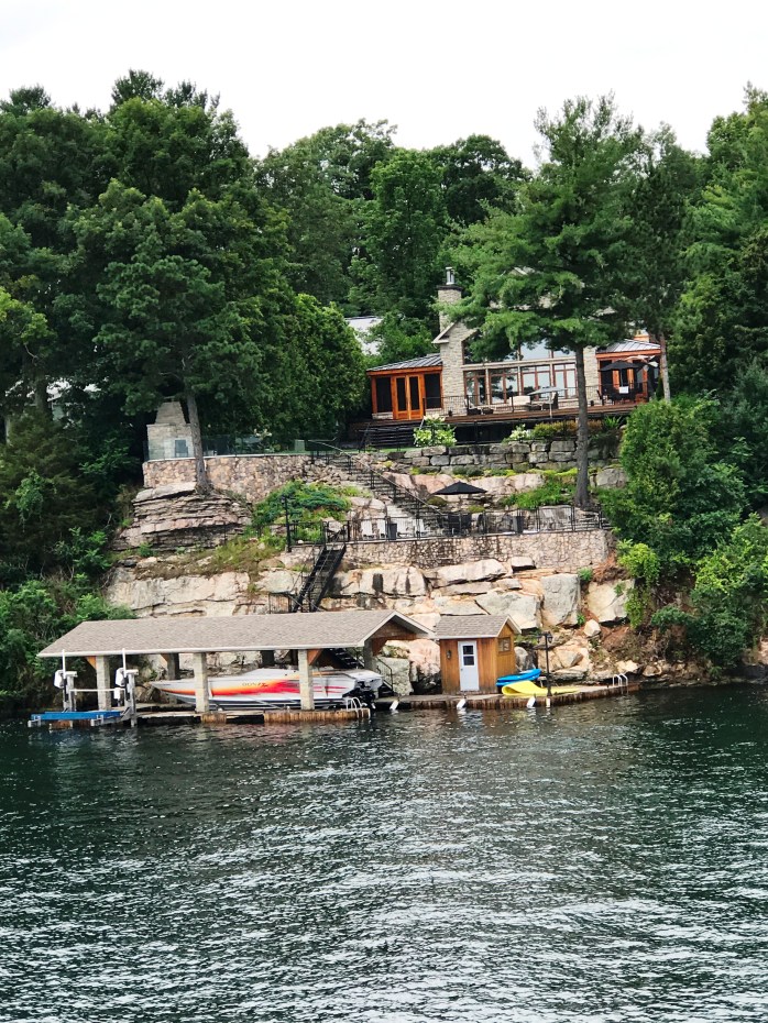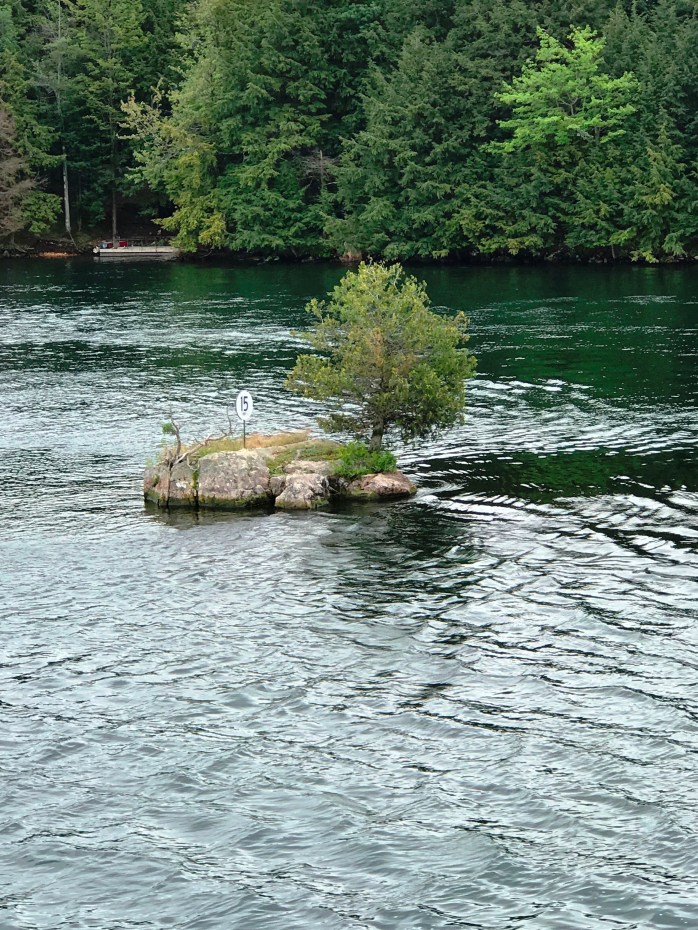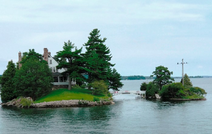 The Thousand Islands stretch stretch out about 50 miles in the St. Lawrence River (which starts at the northeast corner of Lake Ontario, connecting the Great Lakes with the Atlantic Ocean just down stream from Quebec City) and are part of the international boundary between the US and Canada. Most of the islands are on the Canadian side in the Providence of Ontario, but many of the largest of the islands are on the US side in the state of NY. None of the islands straddle the US/Canadian border, however, a popular bit of trivia is that Zavikon Island is a pair of islands in which the larger is in Canada and the smaller in the US with the smallest International footbridge in the world joining them….this, per Wikipedia, is not accurate – both Zavikon is completely inside the Canadian Providence of Ontario…..cool story, though!