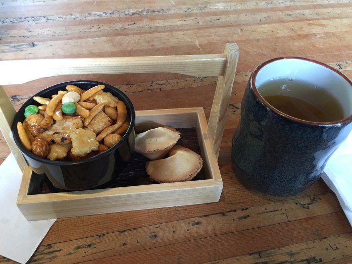 You can’t go to a Japanese Tea Garden without having tea! And, I do love tea! This is a steaming cup of Jasmine Tea and Arare – a snack mix and two fortune cookies – very good!