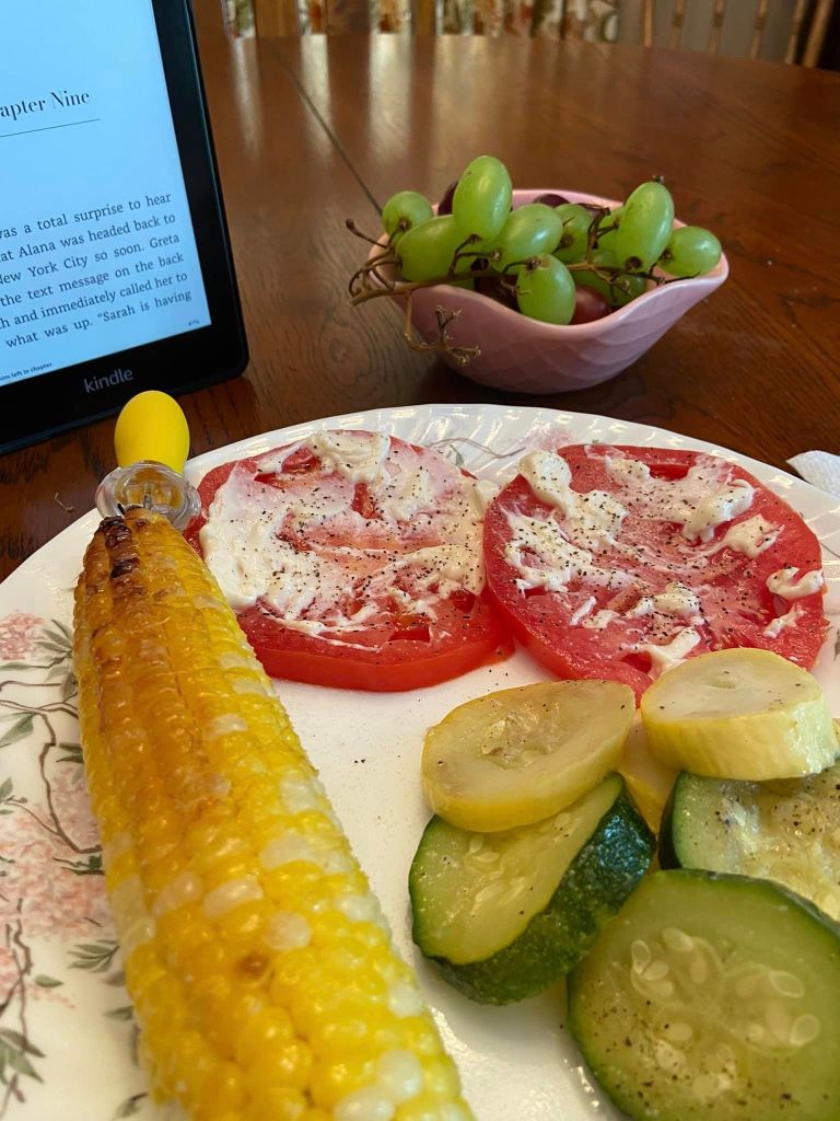 Spent a wonderfully quiet and peaceful day! I visited with my brother and sister-in-law for a while in the early afternoon and I, of course, grilled out…..the corn and squash I bought yesterday and added sliced tomatoes, grapes, and cherries from the same farm market hop adventure! Delicious!!!